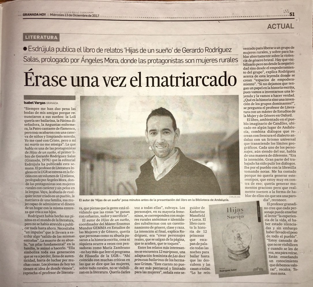En esta nota de prensa del día 13 de diciembre de 2017 para la sección de ‘Literatura’ del periódico Granada Hoy, la periodista Isabel Vargas recoge nuestra charla sobre la reescritura del cuento de hadas y la reivindicación de la historia de las mujeres rurales andaluzas en forma de matriarcado.