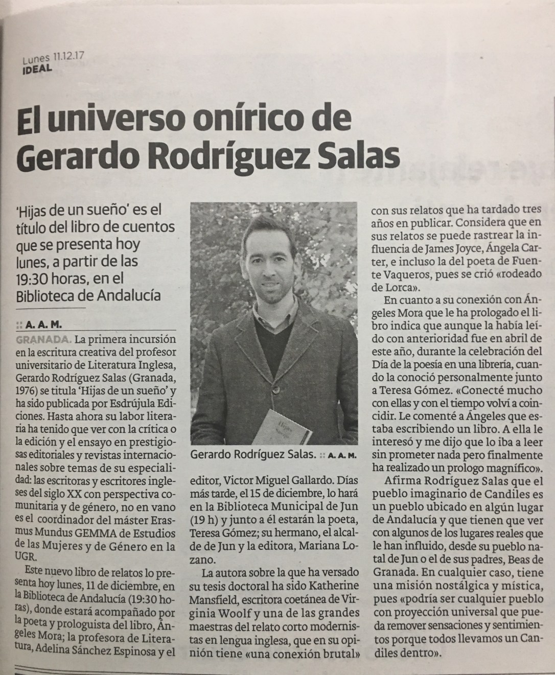 En esta nota de prensa para el periódico Ideal (Granada) del día 11 de diciembre de 2017, el periodista Antonio Arenas anuncia la presentación oficial de mi libro de ese día en Granada (junto a Ángeles Mora y Adelina Sánchez) y la del día 15 de diciembre en Jun (junto a Teresa Gómez y José Antonio Rodríguez) y resume los puntos más importantes de nuestra entrevista de la semana anterior, que podéis escuchar en la sección de Entrevistas (Audio).