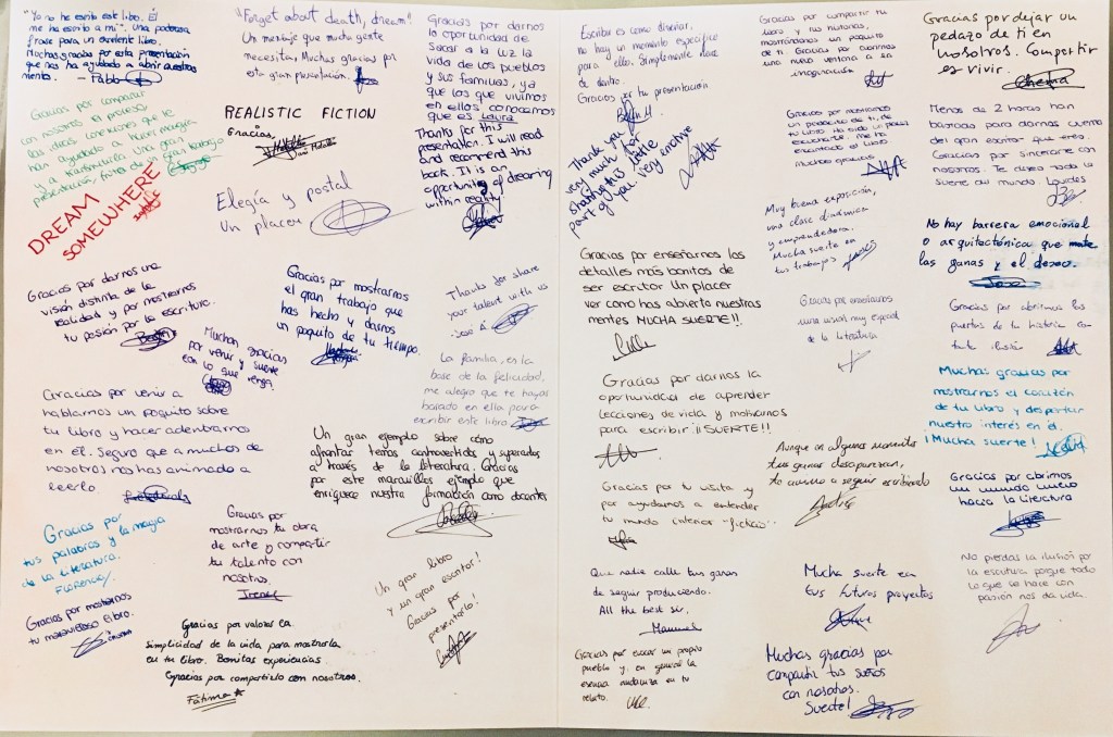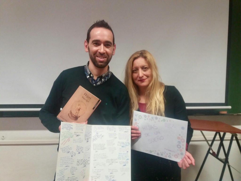 Fue mi primer contacto con alumnado no como profesor, sino como escritor. Preparé una presentación Powerpoint donde les conté en inglés cómo nació Hijas de un sueño y mis influencias literarias. Les di unas pinceladas de cada uno de los doce relatos, explicando aspectos narratológicos como la figura del narrador, punto de vista, escenario, metaficción, etc. Acabé leyendo varios fragmentos de mi libro, que fueron recibidos con mucho cariño y atención.