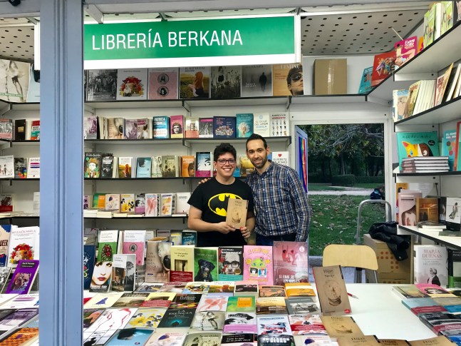 En la caseta de firmas de Berkana, me sentí muy arropado tanto por l@s amig@s como por la gente que paseaba por el Retiro y se acercaba a interesarse por mi libro. Mi compañero de Berkana, Ignacio, me hizo pasar un buen rato con sus chascarrillos y su fantástica camiseta de Batman.
