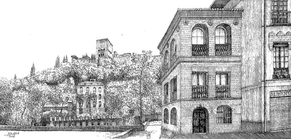 El cielo se bebió de un sorbo el vino tinto de la Sabika. El ocaso se quebró como las ascuas de una chimenea. Mientras los dedos danzaban por las teclas del oboe, sus zapatos agujereados colgaban sobre el río, alejados del muro de piedra en el que estaba sentada. Quenco movía la cabeza al ritmo de «Granada» y, acurrucado junto a su dueña, miraba indolente al corrillo de turistas. Con aire majestuoso, la Torre de Comares alzó la cabeza entre árboles oscuros y, de sus enaguas, asomó el Hotel Reúma que, modesto y desconchado, dibujó una casa de muñecas en su fachada. Los recuerdos resbalaron por la bóveda escamada y la maletita de sueños resonó con voces del pasado.