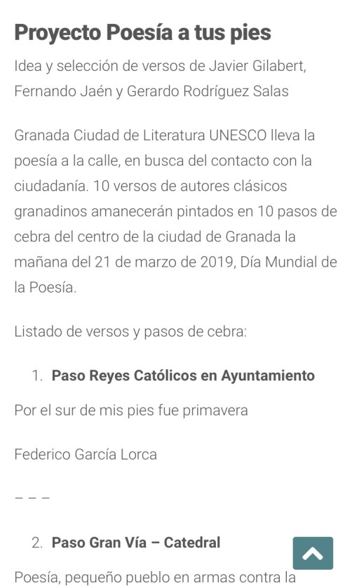 Este proyecto consiste en que el Día de la Poesía amaneciera Granada pintada de versos, concretamente 10 pasos de peatones céntricos con versos escritos en tinta negra sobre fondo blanco. 10 poetas clásicos granadinos.