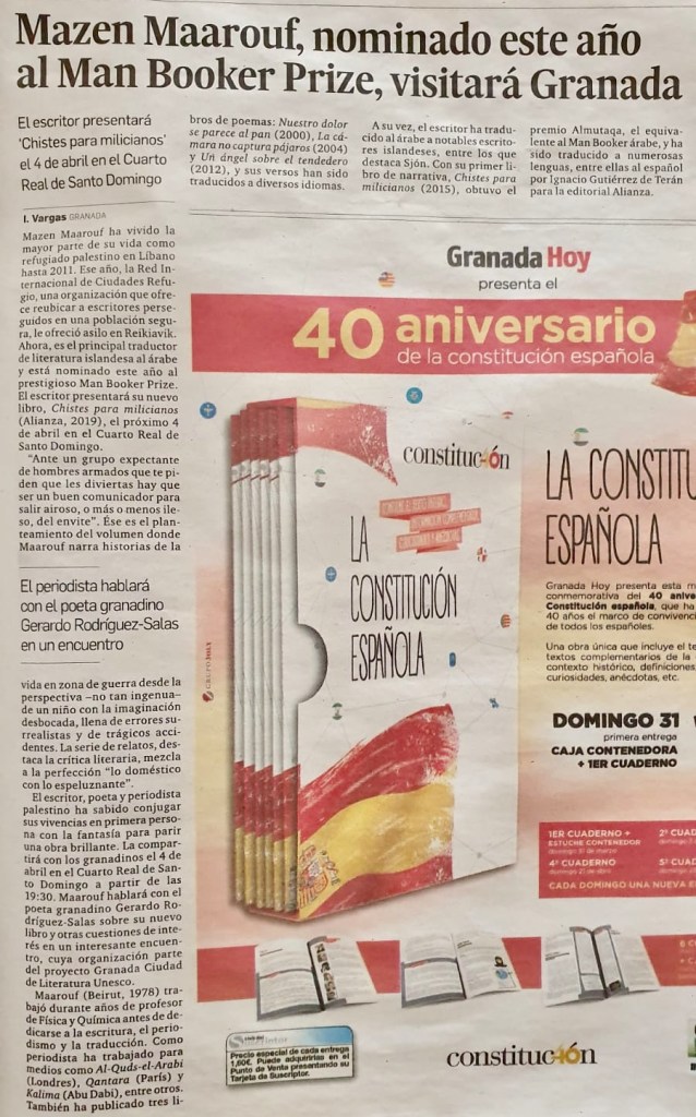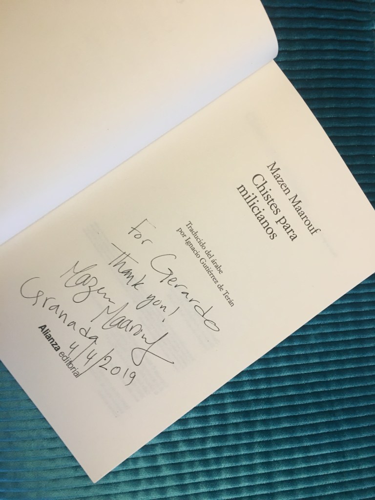 Mazen Maarouf ganó el premio Almutaqa (uno de los más prestigiosos en las letras árabes) por su colección Chistes para milicianos, traducido al español por la editorial Alianza. Apenas unos días antes de la charla en Granada, se conoció su nominación al prestigiosísimo International Man Booker Prize 2019 (trece finalistas en total) por su traducción al inglés de Jonathan Wright para Portobello books.