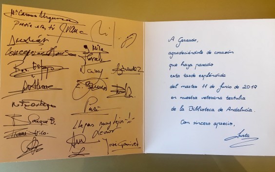 El 11 de junio de 2019 fui invitado a participar en la tertulia literaria que, desde hace 12 años, se celebra en la Biblioteca de Andalucía de Granada, dirigida magistralmente por Justa Gómez.