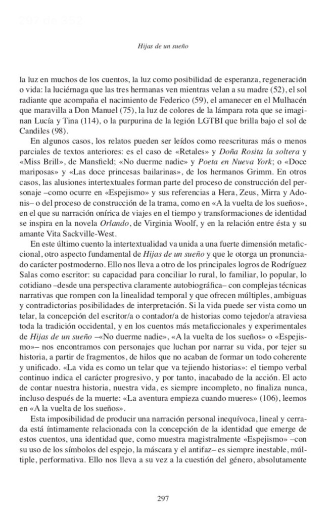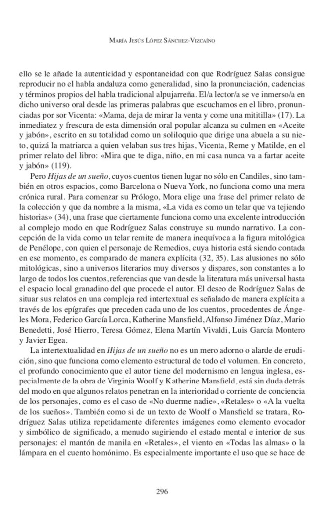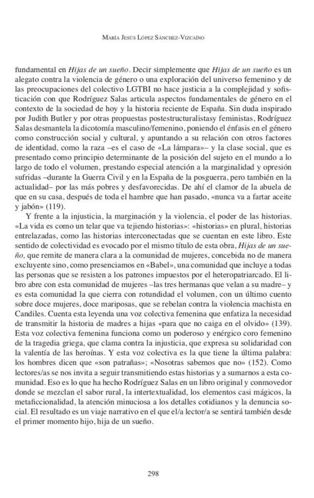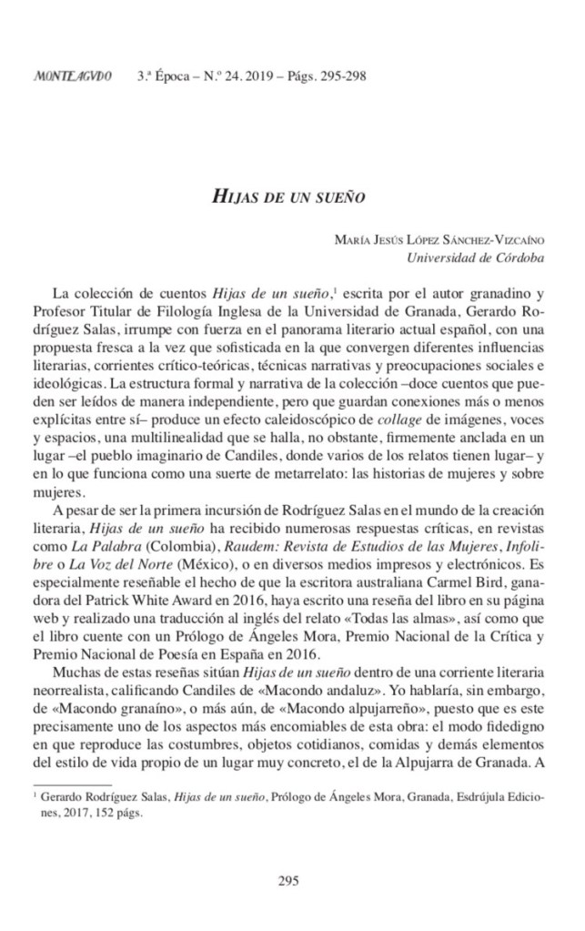 El 25 de octubre de 2019 se publicó el número 24 de la revista académica Monteagudo: Revista de Literatura Española, Hispanoamericana, Teoría de la Literatura y Literatura Comparada (ISSN: 1989-6166), un monográfico dedicado a ‘Caminos y retos de la narrativa española: siglo XXI’. En dicho volumen apareció una reseña de Hijas de un sueño, realizada por la profesora titular de literatura de la Universidad de Córdoba Mª Jesús López Sánchez Vizcaíno.