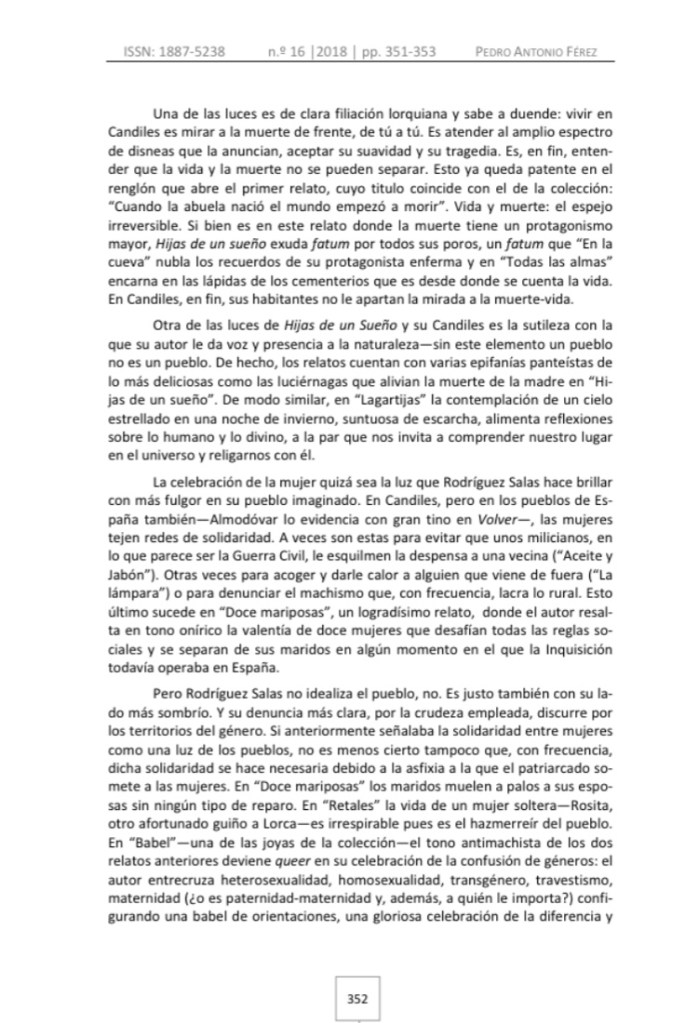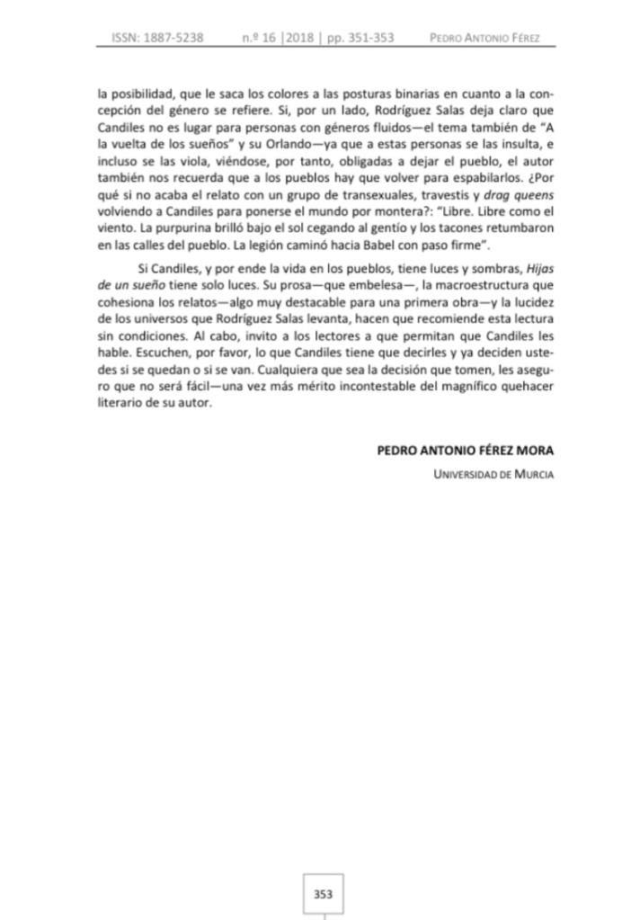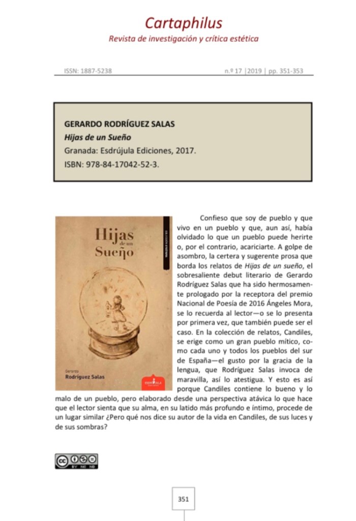 El 11 de enero de 2020 se publicó el número 17 de la revista académica Cartaphilus: Revista de Investigación y Crítica Estética (ISSN: 1887-5238). En dicho volumen apareció una reseña de Hijas de un sueño, realizada por el profesor titular de la Universidad de Murcia Pedro Antonio Férez Mora.