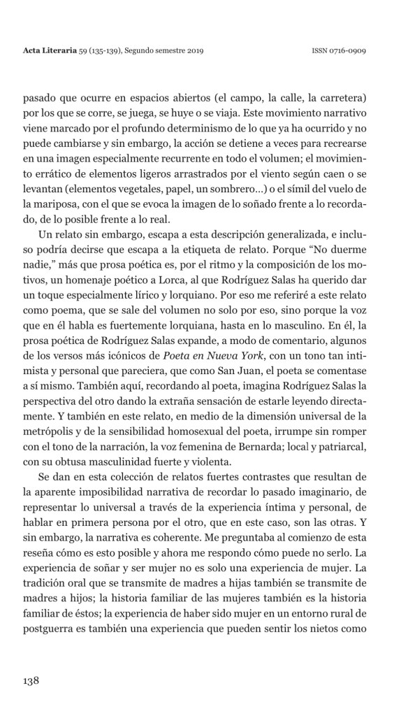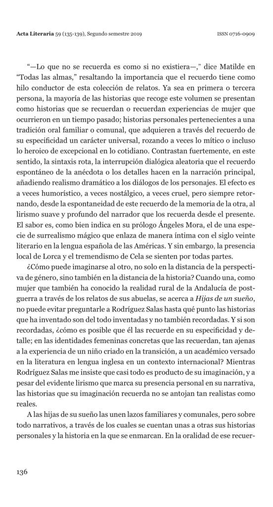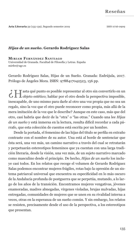 El número 59 (segundo semestre) de la revista chilena de Teoría Literaria y Literatura Comparada Acta Literaria (correspondiente a diciembre de 2019) recogió una reseña de Hijas de un sueño realizada por la doctora Míriam Fernández Santiago (pp. 135-139).