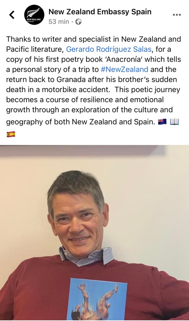 El 11 de diciembre de 2020, la Embajada de Nueva Zelanda en España se hizo eco de mi libro Anacronía a través del embajador, el señor Nigel Fyfe. Mi más sincero agradecimiento a la Embajada por su generosidad y por apoyar mi proyecto poético. Gracias por el mensaje en su página oficial de Facebook, que copio aquí: