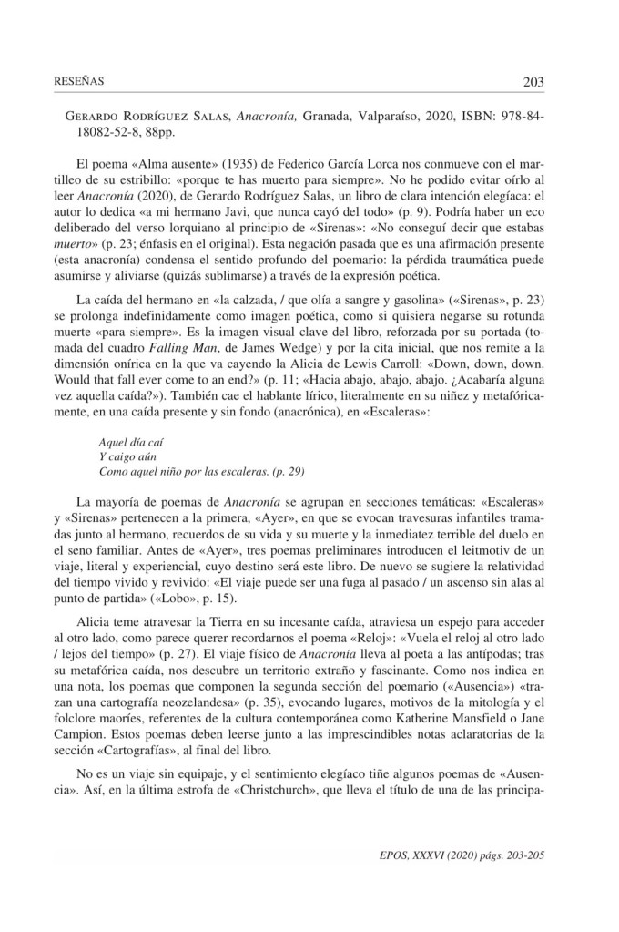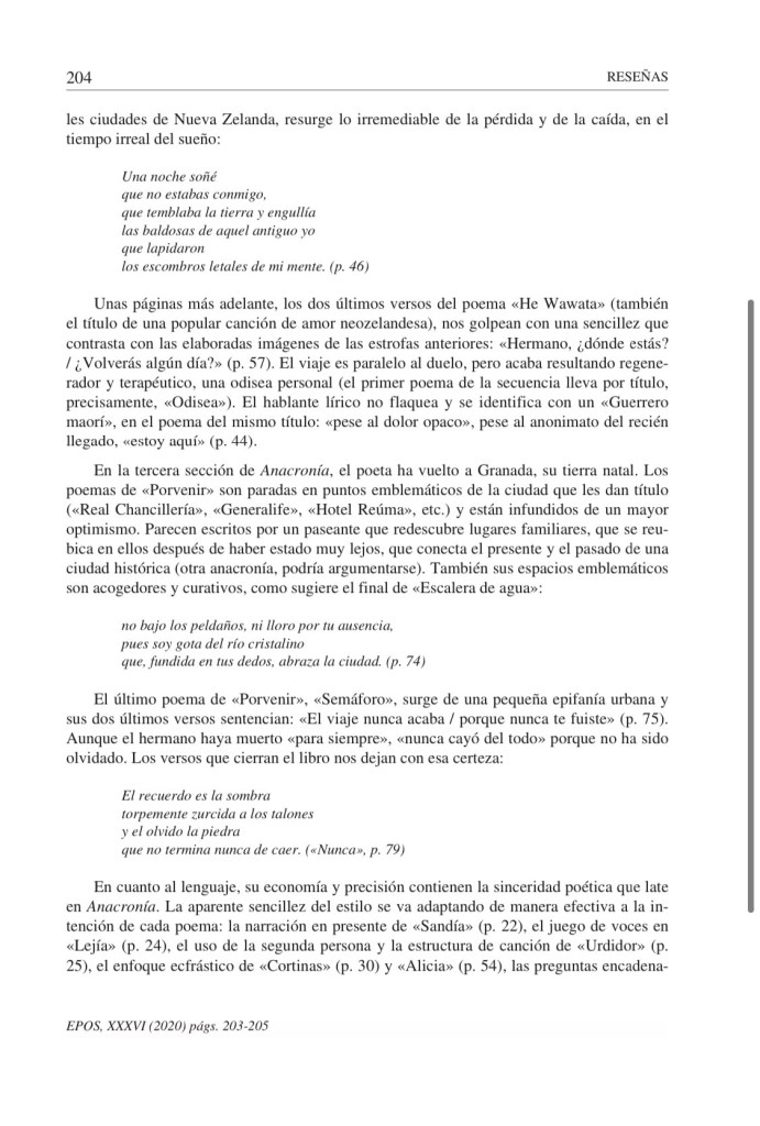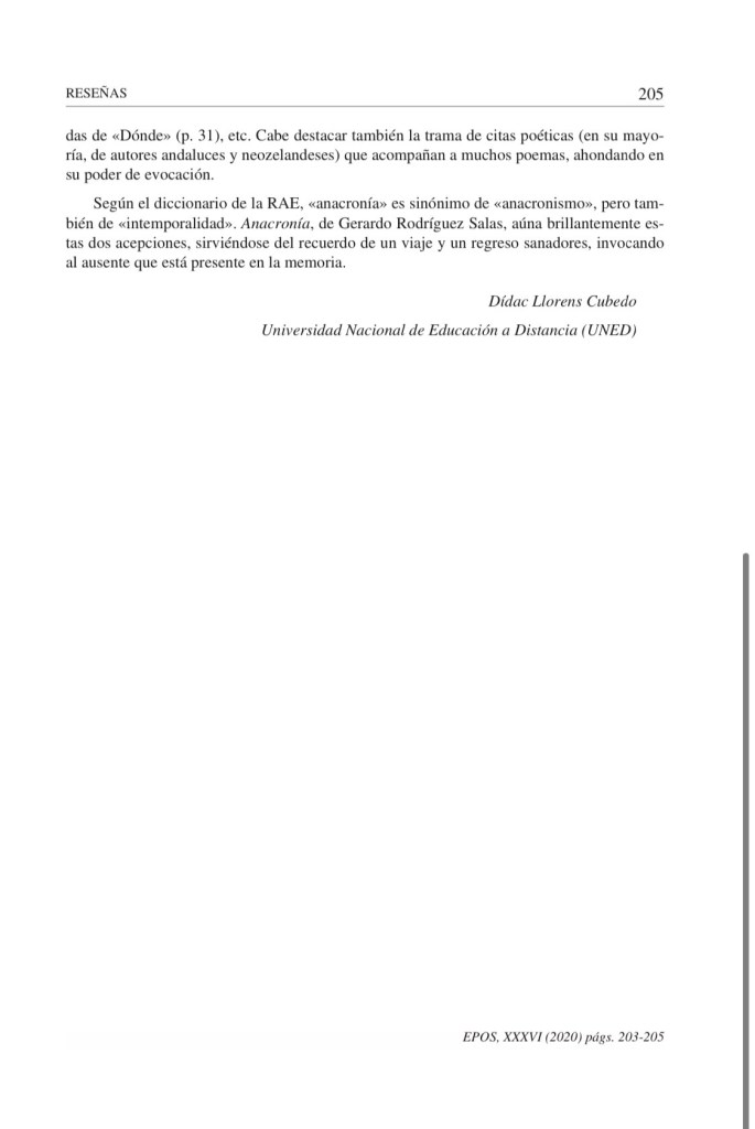 El 15 de diciembre de 2020 la revista académica EPOS: Revista de Filología publicó su número 36 (2020). Esta revista, fundada en 1984, recoge en esta ocasión una reseña sobre mi libro de poemas Anacronía del profesor de la UNED Dídac Llorens Cubedo (pp. 203-205). Gracias por esta generosa lectura y por dedicarme un espacio en vuestra revista.