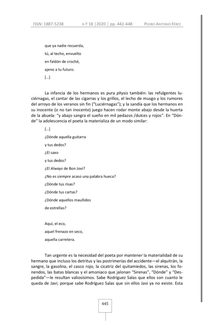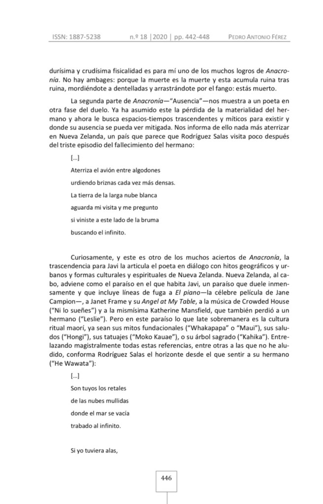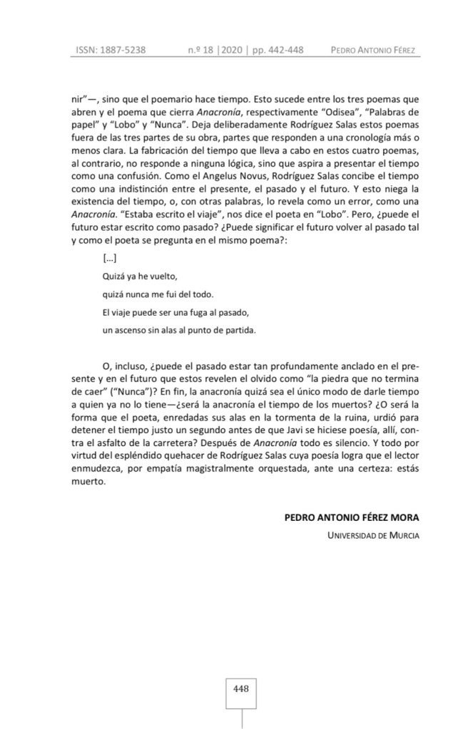 El 11 de enero de 2021 se publicó el volumen 18 (2020) de la revista académica Cartaphilus: Revista de investigación y crítica estética (ISSN: 1887-5238), donde se incluyó la reseña de Pedro Antonio Férez Mora sobre mi poemario Anacronía.