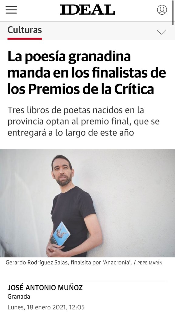 Son tres los autores granadinos que han resultado finalistas en esta edición, según la organización, integrada por los miembros de la Asociación Andaluza de Escritores y Críticos Literarios. El primero de ellos es Gerardo Rodríguez Salas (1976), quien sitúa a su más reciente poemario, ‘Anacronía’, editado por el sello granadino Valparaíso, en la codiciada lista final. Según su autor, «’Anacronía’ abre con la dedicatoria a mi hermano Javi -fallecido en un accidente de tráfico-, «que nunca cayó del todo», y una cita de ‘Alicia en el país de las maravillas’ que hace alusión a la caída, la imagen central del poemario que sugiere el cuadro de la portada de James Wedge. Todo el que ha perdido a un ser querido me va a comprender: mi hermano nunca se ha ido. El olvido desdibuja algunos detalles, pero también ayuda a limar el dolor y sus aristas. Mientras la piedra no caiga del todo, el recuerdo estará en al aire, volando siempre». Y añade: «Lo que más daño me hace ahora es el dolor de la pérdida ligado al olvido. Los seres queridos que se marcharon en esta situación distópica se han convertido en números sin poder siquiera despedirse de los suyos, aislados y solos. Yo no pude despedirme de mi hermano y así lo reflejo en el poema ‘Despedida’. Ese dolor es más difícil de encajar. Mi libro va dedicado a quienes habéis perdido a un ser querido y encontráis en mi odisea pequeñas islas de palabras en las que refugiaros durante la tormenta».