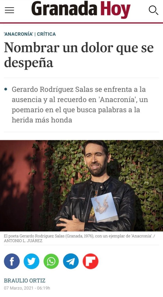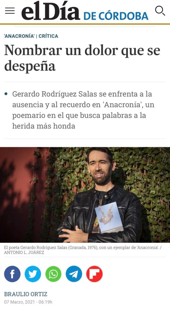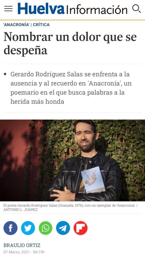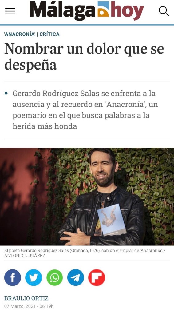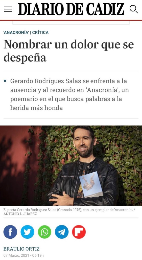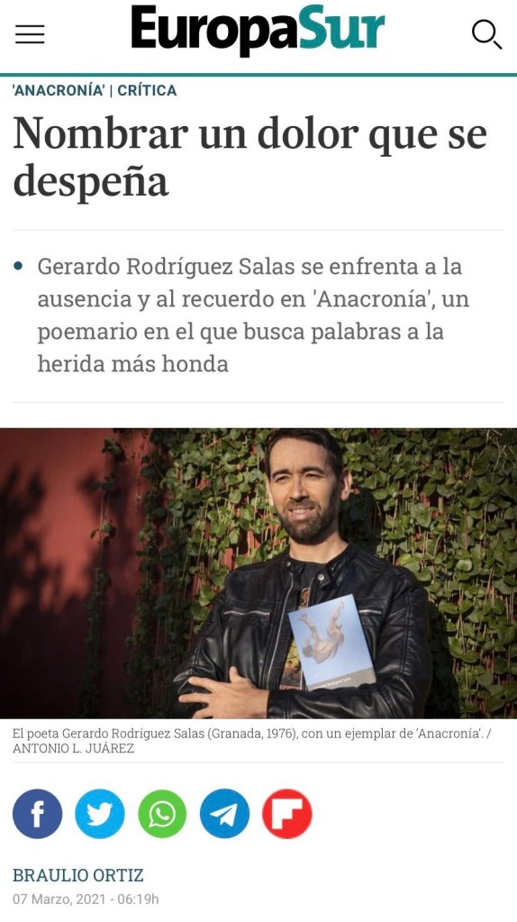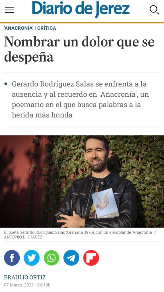 Baulio Ortiz Poole me regala esta generosa y emotiva reseña sobre mi libro Anacronía, que se ha publicado hoy, simultáneamente, en Diario de Sevilla, Granada Hoy, Málaga Hoy, El Día de Córdoba, Diario de Cádiz, Diario de Almería, Huelva Información, Diario de Jerez y Europa Sur.