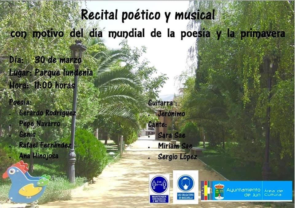Con motivo de la celebració del Día Mundial de la Poesía y la llegada de la primavera, el área de Cultura del Ayuntamiento de Jun organizó un acto el 30 de marzo de 2021 en el Parque Iundenia, donde fui invitado.