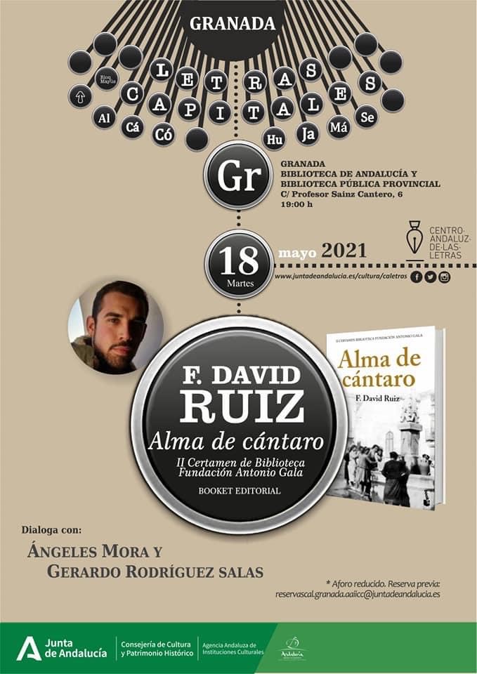 El 18 de mayo de 2021 presenté, junto a Ángeles Mora, la primera novela de Francisco David Ruiz, titulada Alma de cántaro (Booket, 2020). Este libro, una novela polifónica sobre mujeres rurales ubicada en Córdoba, fue finalista del XXVII Premio Andalucía de la Crítica. El acto se ubicó dentro del programa ‘Letras Capitales’ del Centro Andaluz de las Letras en la Biblioteca de Andalucía de Granada.