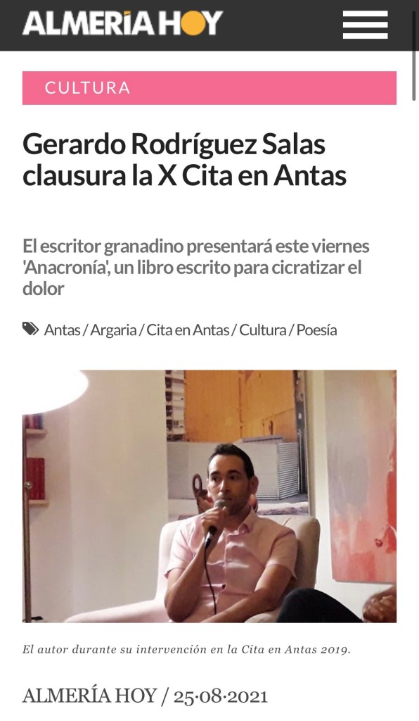 El 27 de agosto de 2021 fui invitado por la Asociación Cultural Argaria y el Ayuntamiento de Antas a clausurar la X Cita en Antas con la presentación de mi libro Anacronía. El poeta y periodista Javier Irigaray fue el encargado de presentarme y también de firmar una magnífica entrevista previa que se publicó en Almería Hoy.