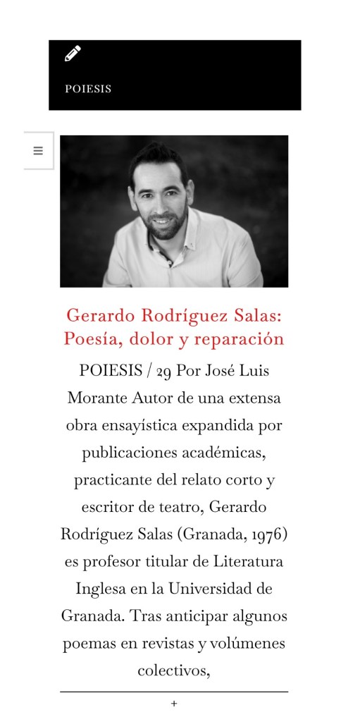 El 26 de septiembre de 2021, José Luis Morante hizo una selección de 10 poemas míos (con dos inéditos: ‘Lady Bowen Falls’ y ‘La Comarca’) para la sección ‘Poeisis’ del número 34 (septiembre 2021) de la revista uruguaya con sede en Montevideo, Extramuros. La sección se titula: ‘Poesía, dolor y reparación’.