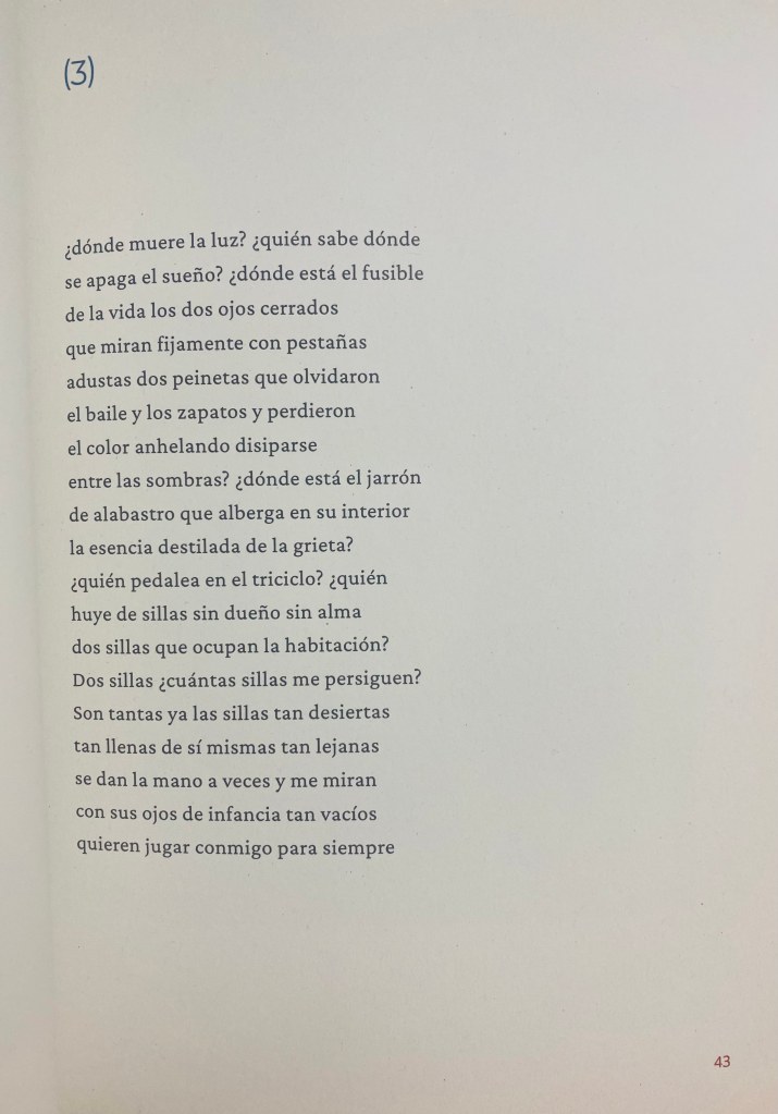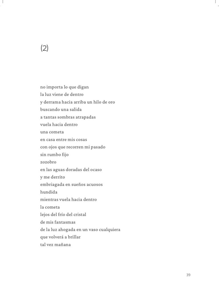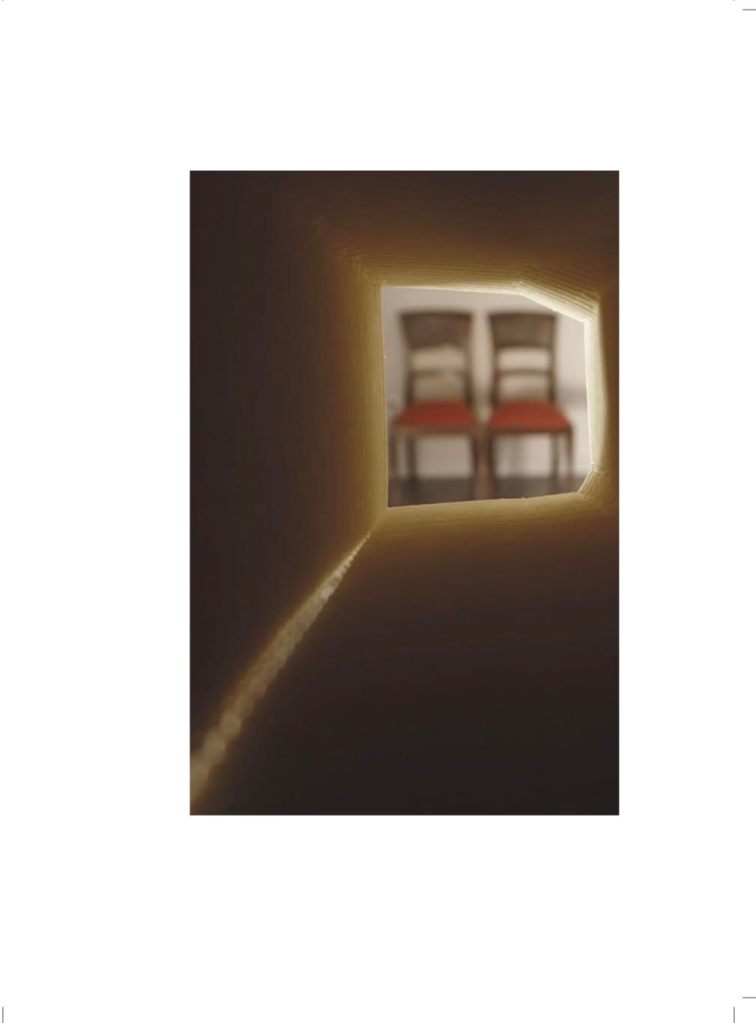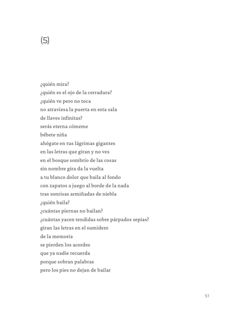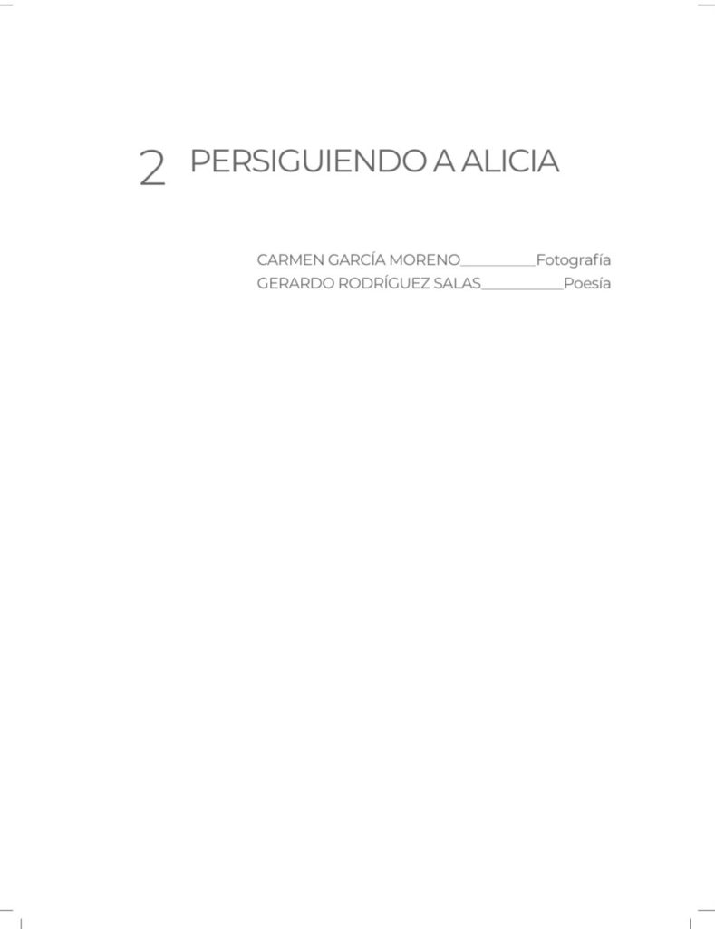 Cada pareja, en mi caso dialogo con la fotógrafa Carmen García Moreno, trabaja libremente su diálogo: en el nuestro partimos de 5 fotos de Carmen, que escogimos atendiendo al motivo de la mirada por la mirilla de Alicia de Lewis Carroll. Nuestra sección, compuesta de 5 poemas y fotos sin título, tiene el título general ‘PERSIGUIENDO A ALICIA‘. El proyecto se presentó en la 39 Feria del Libro de Granada (2021).