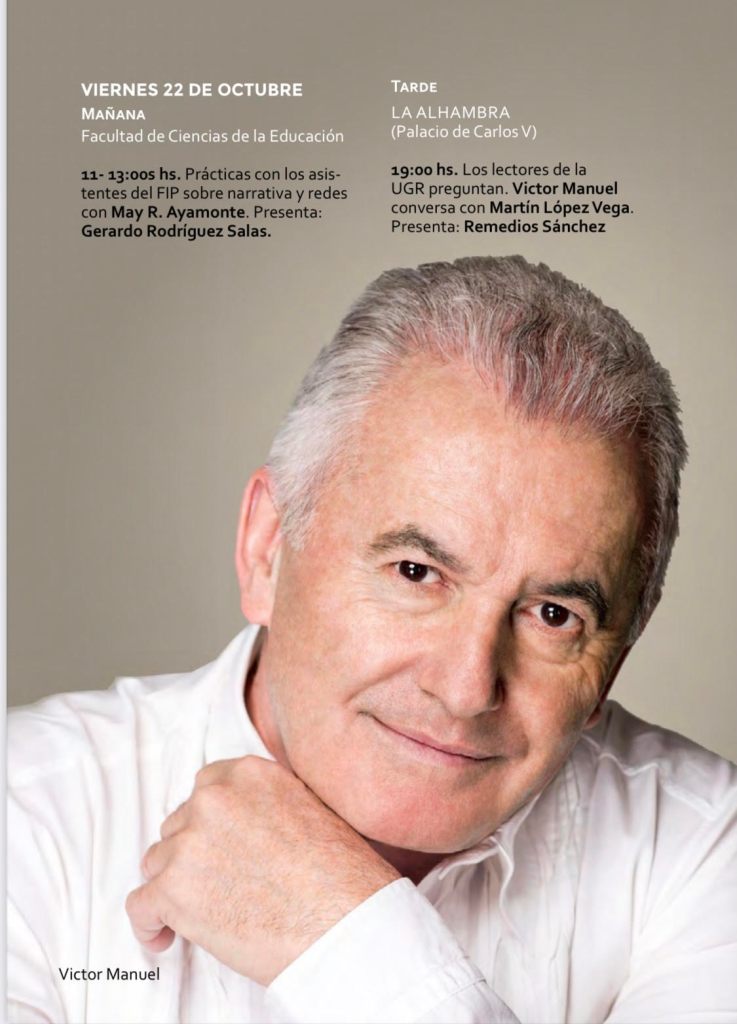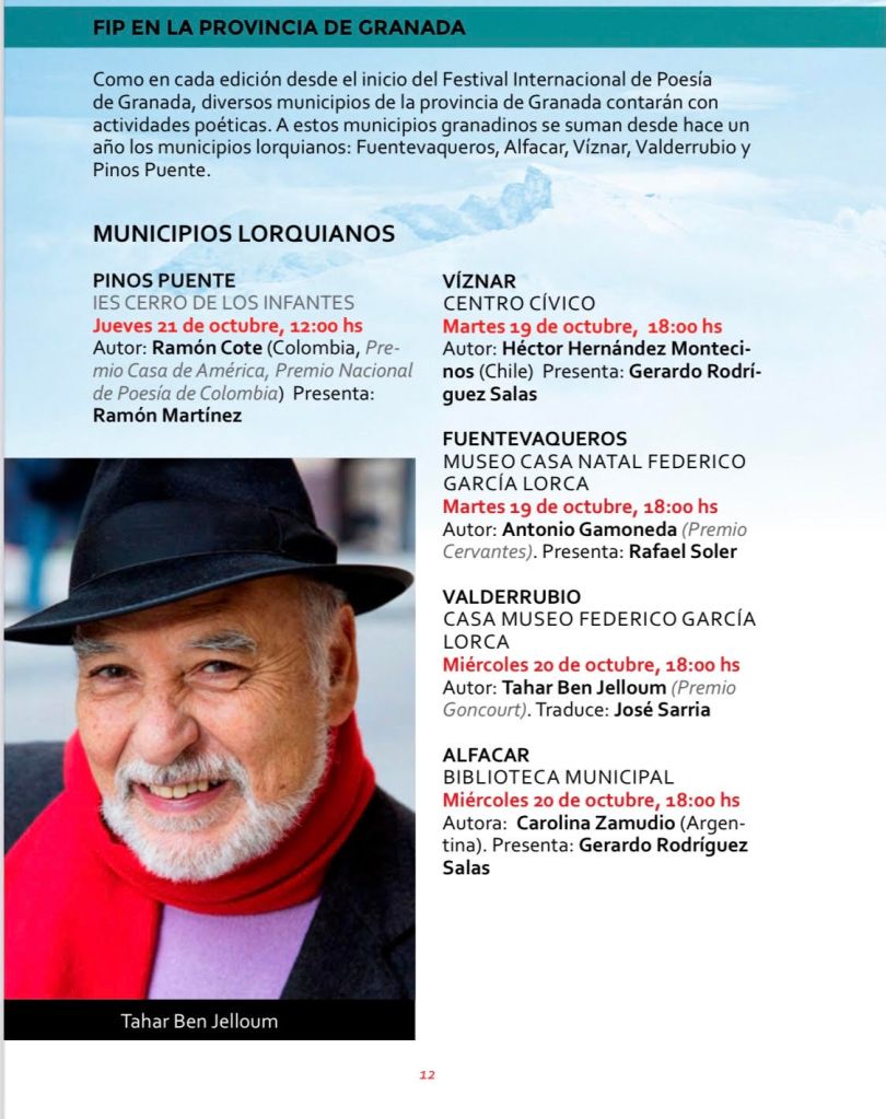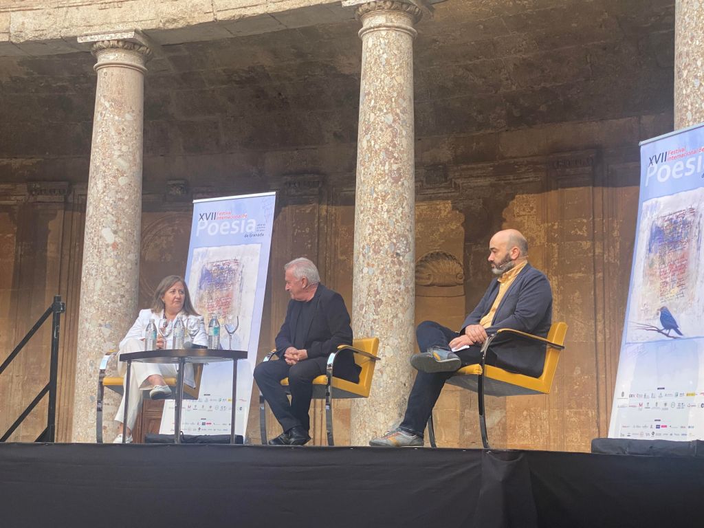 El primero de ellos tuvo lugar el martes 19 de octubre a las 18h en el municipio de Víznar, donde conversé con el poeta chileno Héctor Hernández Montesinos (Premio Pablo Neruda). Este acto me hizo entender la importancia de acercar el Festival Internacional de Poesía Ciudad de Granada a los municipios de nuestra provincia. Recuerdo la mirada atenta del público escuchando a un Héctor cercano y honesto. Hablamos de su generación ‘novísima’, de su voz comunitaria, rebelde y comprometida, de los límites realidad/ficción, de la poesía como espacio de resistencia y aprendizaje frente a la intolerancia. Me quedo con el entusiasmo de un público entregado en un lugar con vistas al Barranco de Víznar y la memoria de Federico García Lorca.