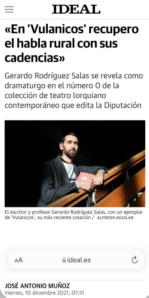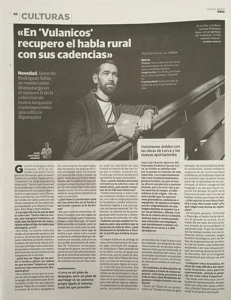 Entrevista realizada por José Antonio Muñoz en el periódico Ideal (Granada) sobre Vulanicos y la presentación junto a Alberto Conejero del 10 de diciembre de 2021.