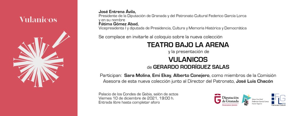 El 10 de diciembre de 2021 se presentó en el Palacio Condes de Gabia de Granada mi primer texto teatral, Vulanicos, inspirado en el relato central de mi libro Hijas de un sueño. Con Vulanicos, prólogo de Alberto Conejero, se inaugura la colección ‘Teatro bajo la arena’ en el Patronato Cultural Federico García Lorca de la Diputación Provincial del Granada. Aquí se puede ver el acto completo: PARTE 1 y PARTE 2.