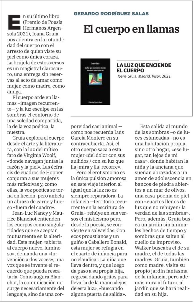 En su último libro (Premio de Poesía Hermanos Argensola 2021), Ioana Gruia nos adentra en la rotundidad del cuerpo con el arresto de quien viste su piel como única coraza. La brújula de estos versos es un magistral claroscuro, una entrega sin reservas al acto de amar como mujer, como madre, como amiga. El cuerpo arde en llamas—imagen recurrente—y la luz esculpe en las sombras el contorno de una soledad compartida, la de la voz poética, la nuestra.