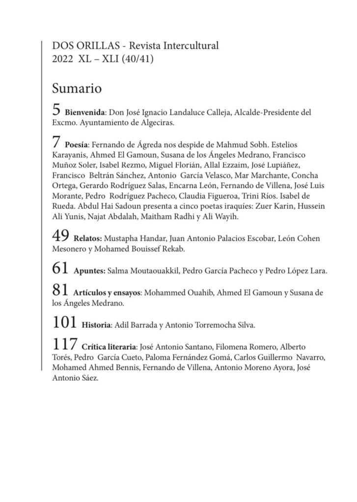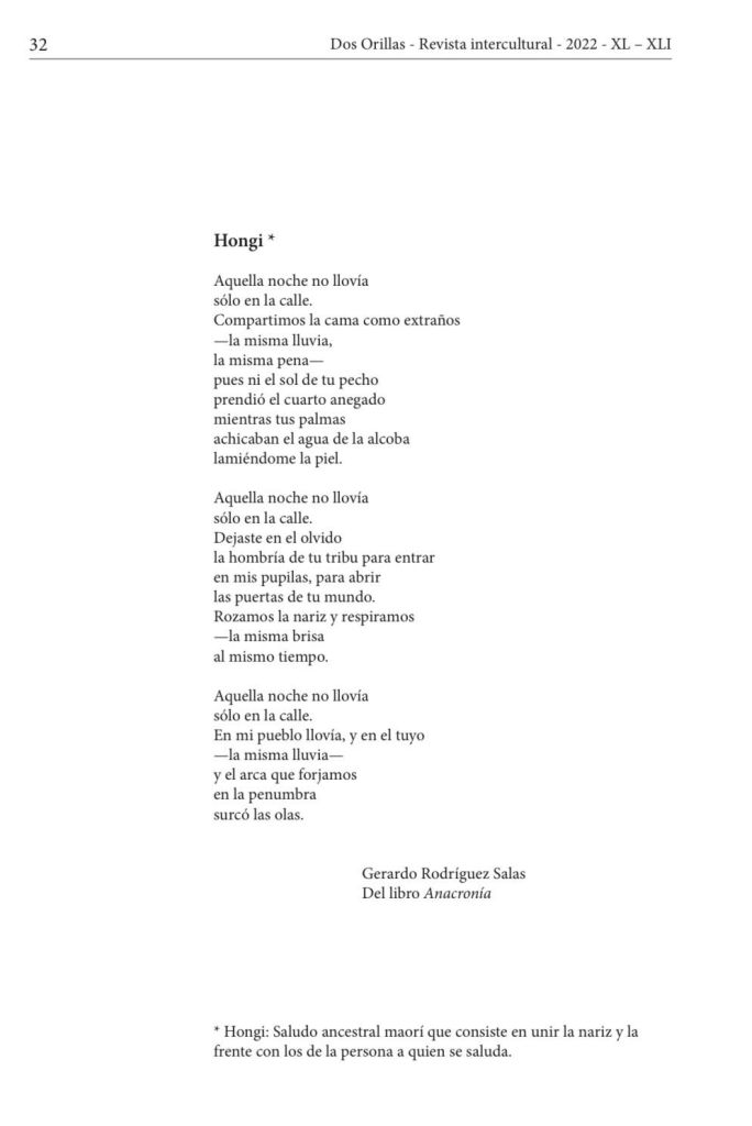 Dos orillas (ISSN: 2255-1816) es una revista literaria anual que aúna la literatura y la cultura de ambas orillas del Estrecho de Gibraltar. Dirigida por Paloma Fernández Gomá, en su número XL-XLI de 2022 incluye mi poema ‘Hongi’, extraído de mi libro Anacronía.