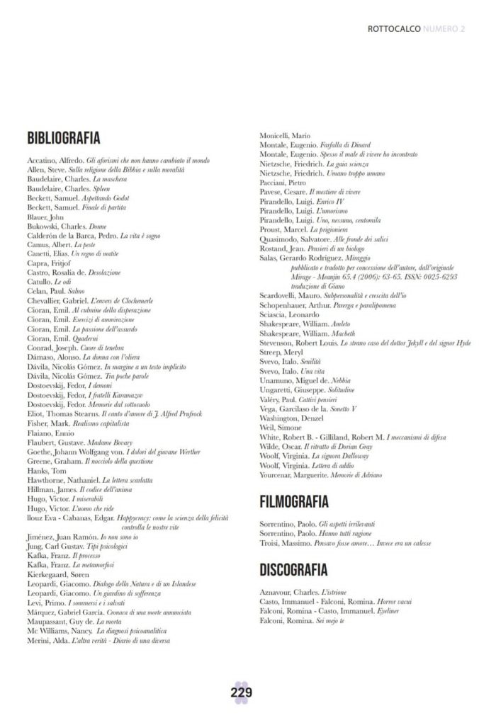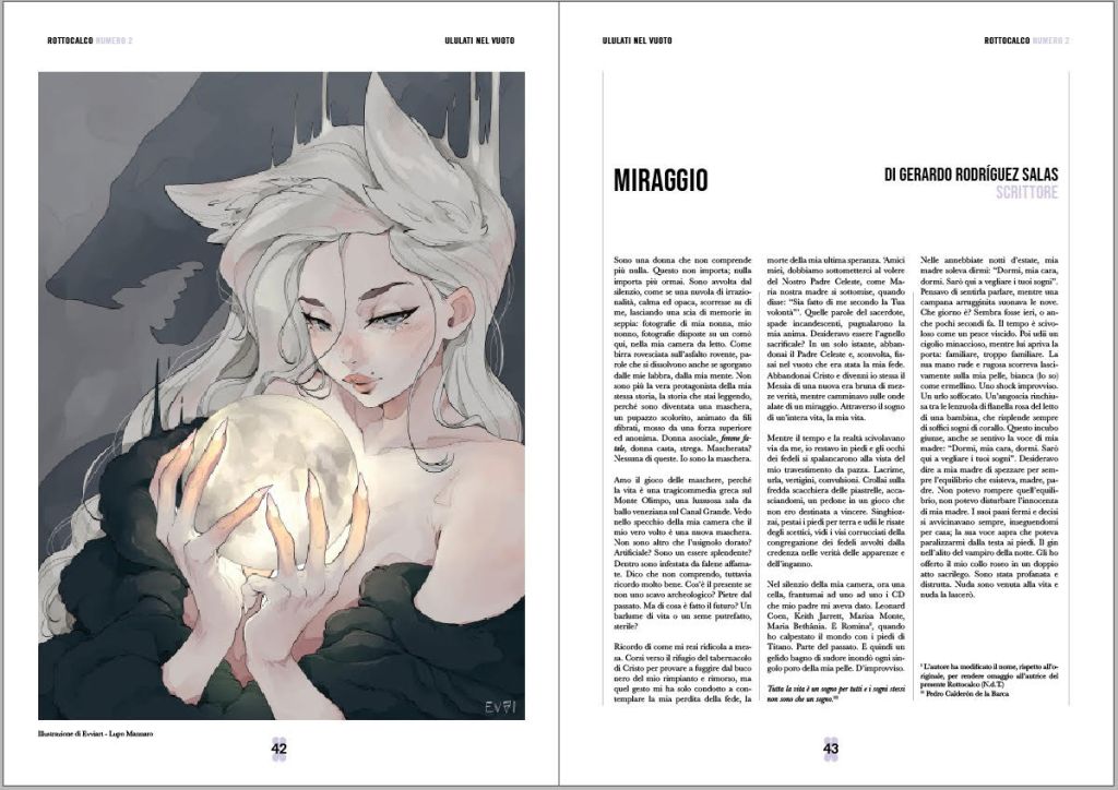 Con traducción al italiano de Giano, mi relato ‘MIRAGE’ –publicado originalmente en la revista australiana Meanjin 65.4 (2006): 63-65 (ISSN: 0025-6293), germen de mi relato ‘Espejismo’ en Hijas de un sueño (Esdrújula, 2017)– apareció como ‘Miraggio’ en el segundo volumen del experimento literario-musical de la cantautora electropop italiana Romina Falconi: Rottocaldo vol. 2, Poliniani editore, 2022, pp. 42-3, ISBN: 979-12-210-1600-0.