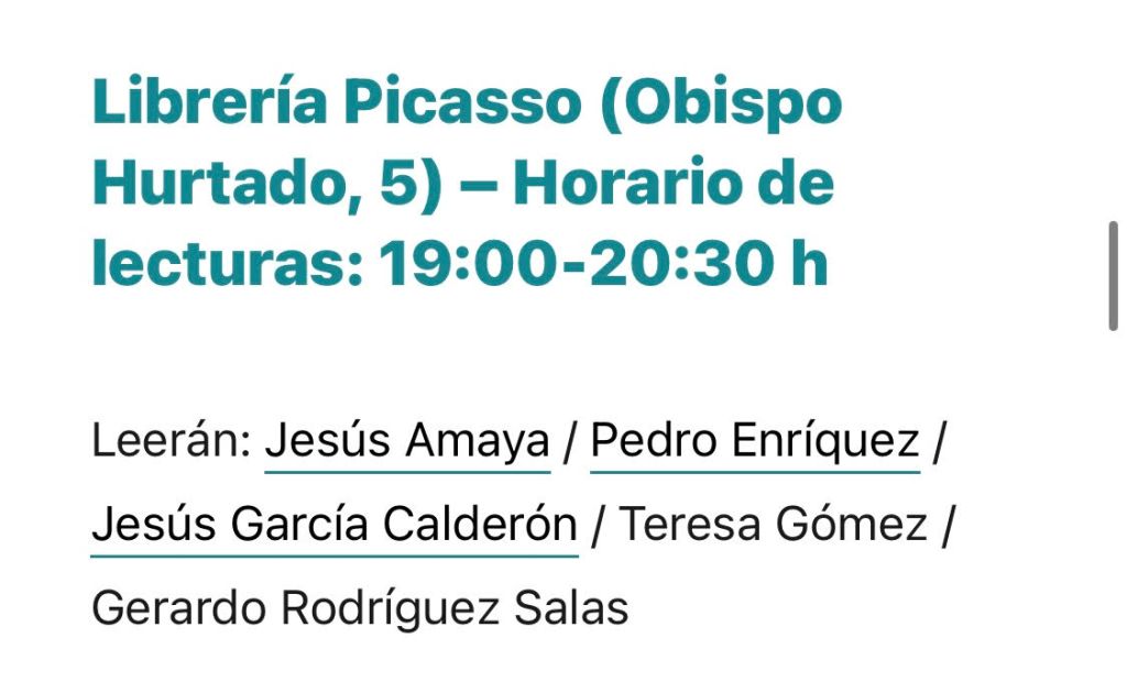 En mi caso, estuve encantado de moderar y participar en la mesa de lectura que tuvo lugar en Librería Picasso, junto a los poetas Jesús Amaya, Pedro Enríquez y Jesús García Calderón y la poeta Teresa Gómez.