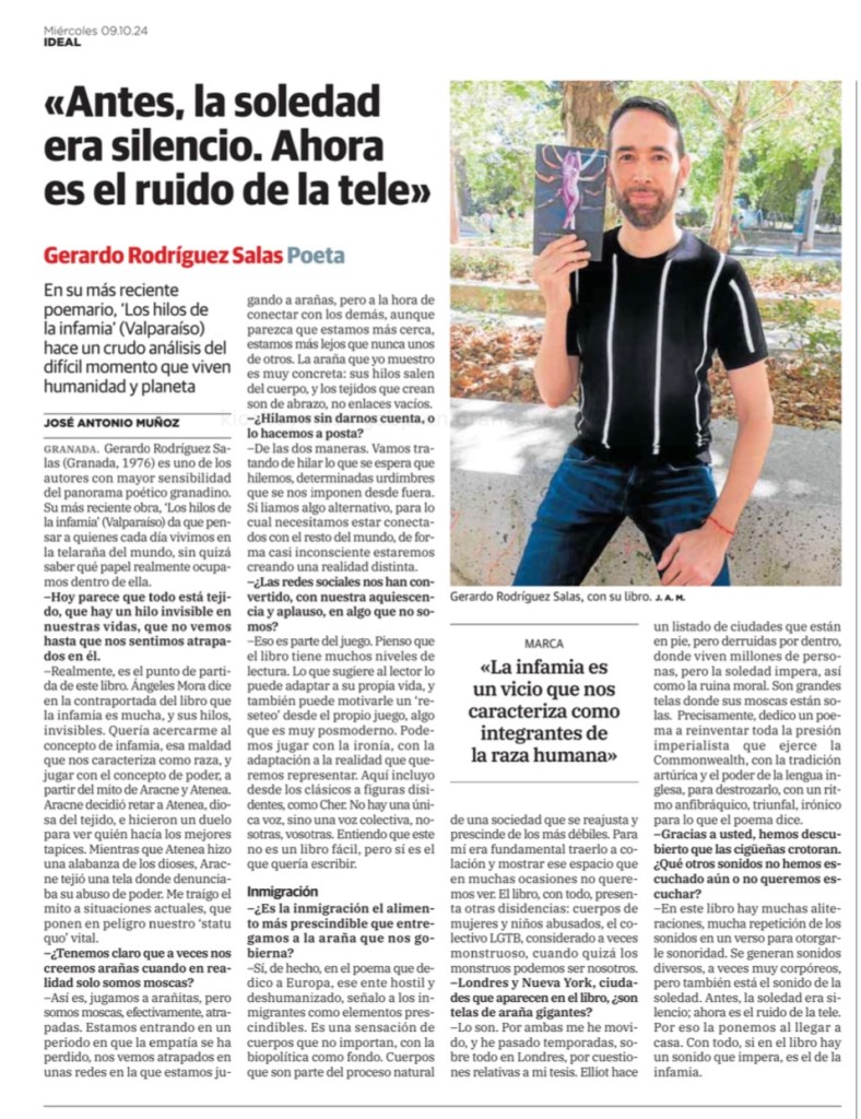 EscritosIDEAL: Entrevista ‘Hilos de la infamia’ (9/10/24) 9 octubre, 2024 gerardorodriguezsalas Screenshot Compártelo: Haz clic para compartir en X (Se abre en una ventana nueva) X Haz clic para compartir en Facebook (Se abre en una ventana nueva) Facebook Me gusta Cargando... Relacionado Páginas: 1 2 Publicado por gerardorodriguezsalas Escritor y Profesor Titular de Literatura Inglesa (UGR) Ver todas las entradas de gerardorodriguezsalas