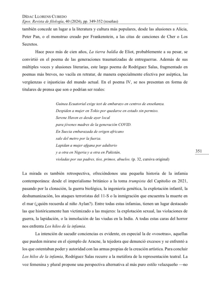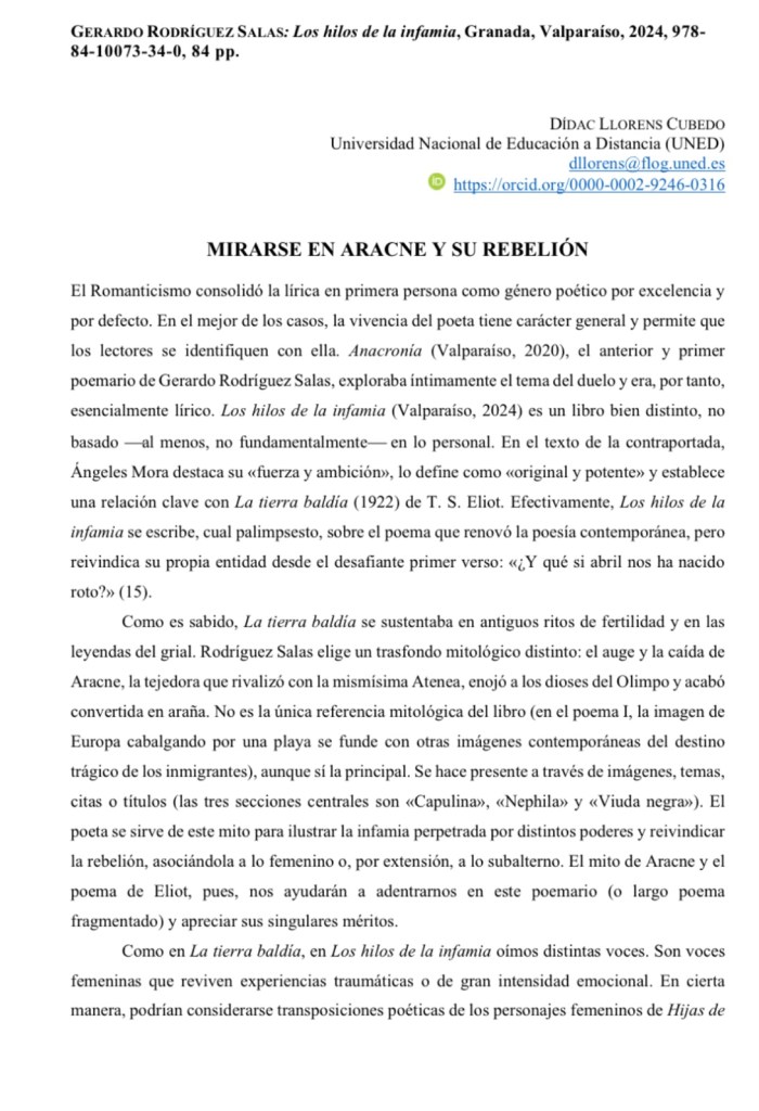 Sin categoríaEPOS: Revista de Filología (UNED): Reseña ‘Hilos de la infamia’ (18/12/24) 19 diciembre, 2024 gerardorodriguezsalas Screenshot Screenshot Screenshot Screenshot Compártelo: Haz clic para compartir en X (Se abre en una ventana nueva) X Haz clic para compartir en Facebook (Se abre en una ventana nueva) Facebook Me gusta Cargando... Relacionado Páginas: 1 2 Publicado por gerardorodriguezsalas Escritor y Profesor Titular de Literatura Inglesa (UGR) Ver todas las entradas de gerardorodriguezsalas