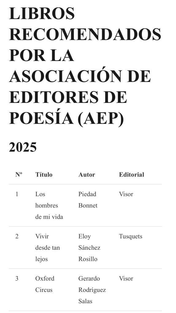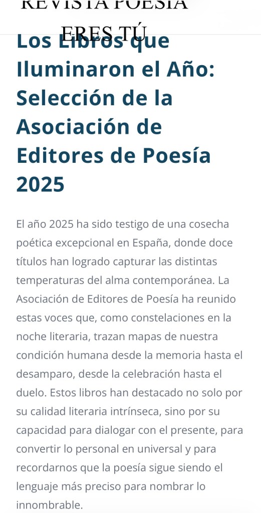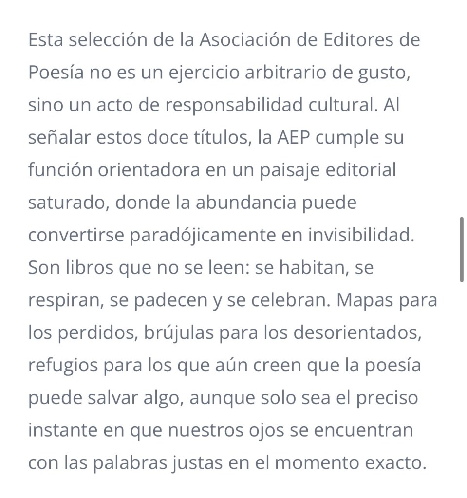 ‘Esta selección de la Asociación de Editores de Poesía no es un ejercicio arbitrario de gusto, sino un acto de responsabilidad cultural (…). Son libros que no se leen: se habitan, se respiran, se padecen y se celebran. Mapas para los perdidos, brújulas para los desorientados, refugios para los que aún creen que la poesía puede salvar algo, aunque solo sea el preciso instante en que nuestros ojos se encuentran con las palabras justas en el momento exacto’.