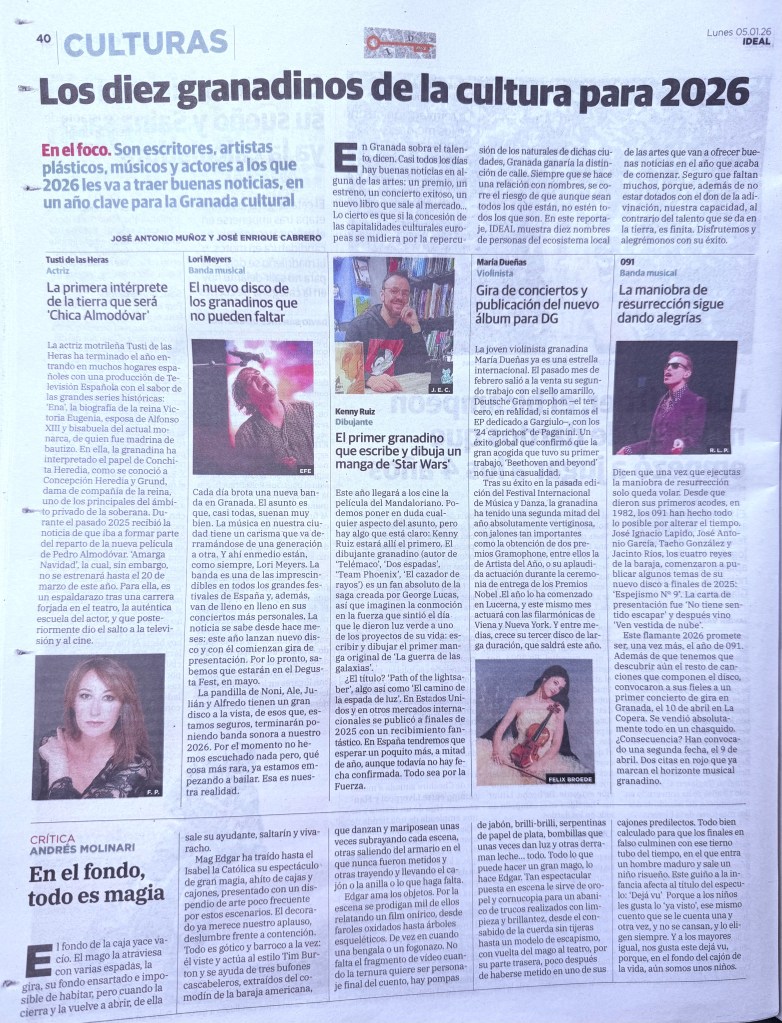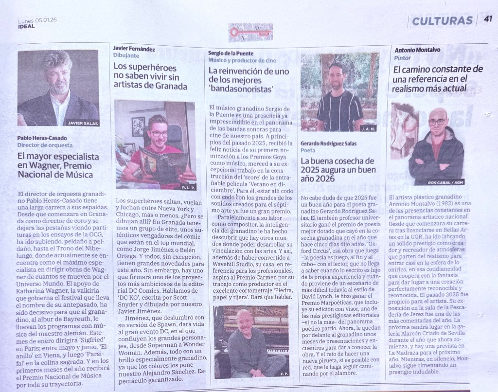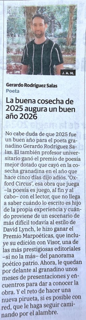 Eventos, ReseñassssIDEAL: ’10 granadinos de la cultura para 2025′ (5/1/26) 5 enero, 2026 gerardorodriguezsalas Compártelo: Haz clic para compartir en X (Se abre en una ventana nueva) X Haz clic para compartir en Facebook (Se abre en una ventana nueva) Facebook Me gusta Cargando... Relacionado Páginas: 1 2 Publicado por gerardorodriguezsalas Escritor y Profesor Titular de Literatura Inglesa (UGR) Ver todas las entradas de gerardorodriguezsalas