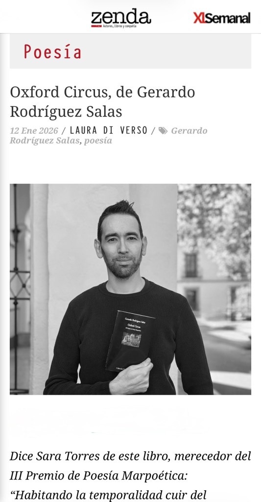 El 12 de enero de 2026 Zenda Libros, la revista literaria digital del suplemento XL Semanal de ABC, volvió a publicar una selección de poemas de Oxford Circus. En este caso, 5 poemas.