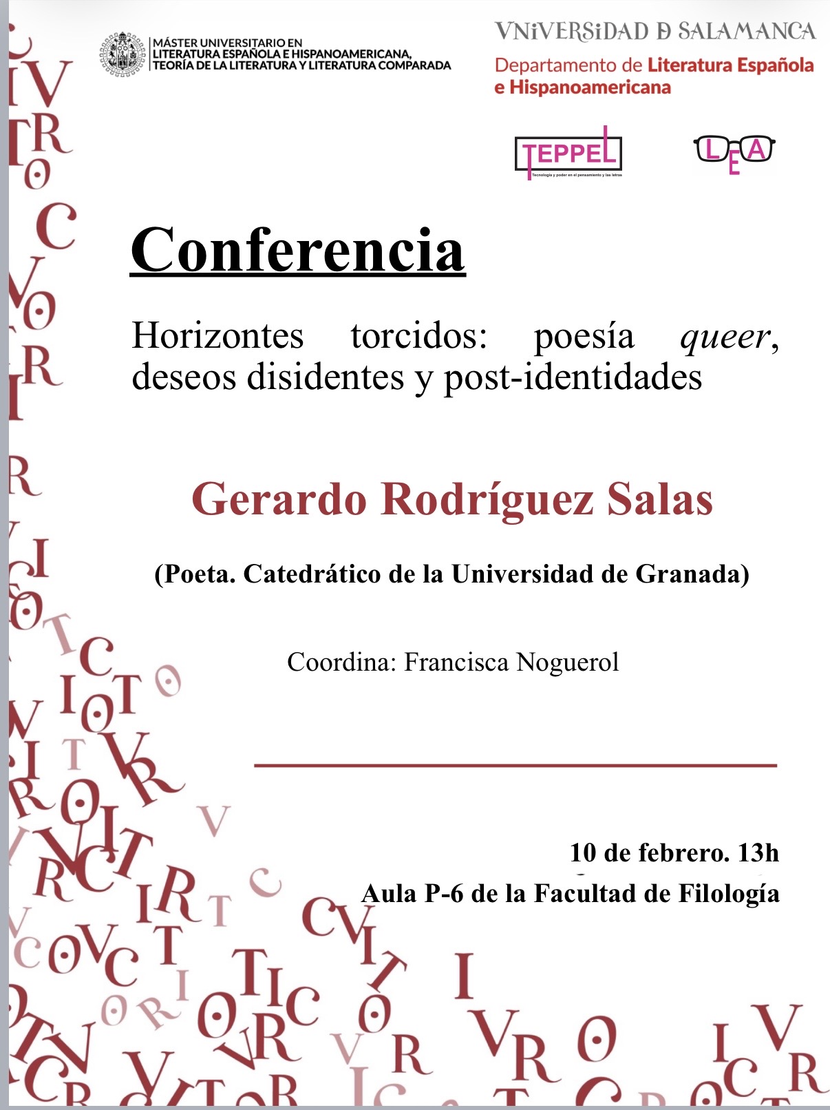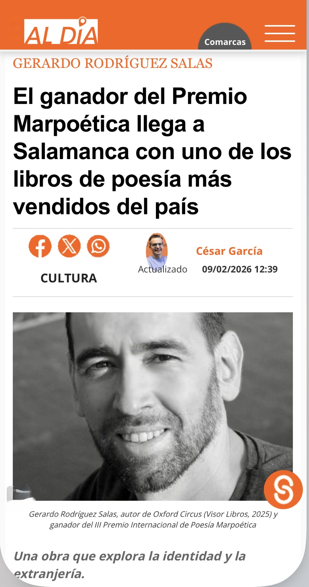 EventosSalamanca: Presentación de ‘Oxford Circus’ en Letras Corsarias (9/2/26) 11 febrero, 2026 gerardorodriguezsalas Compártelo: Compartir en X (Se abre en una ventana nueva) X Comparte en Facebook (Se abre en una ventana nueva) Facebook Me gusta Cargando... Relacionado Páginas: 1 2 Publicado por gerardorodriguezsalas Escritor y Profesor Titular de Literatura Inglesa (UGR) Ver todas las entradas de gerardorodriguezsalas