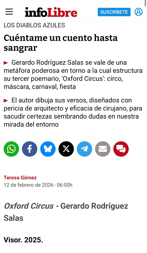 ReseñassssInfolibre: Reseña de ‘Oxford Circus’ por Teresa Gómez (12/2/26) 12 febrero, 2026 gerardorodriguezsalas La poeta Teresa Gómez publicó en ‘Los diablos azules’ de Infolibre la siguiente reseña sobre Oxford Circus titulada ‘Cuéntame un cuento hasta sangrar’. Fue el 12 de febrero de 2026. Compártelo: Compartir en X (Se abre en una ventana nueva) X Comparte en Facebook (Se abre en una ventana nueva) Facebook Me gusta Cargando... Relacionado Páginas: 1 2 Publicado por gerardorodriguezsalas Escritor y Profesor Titular de Literatura Inglesa (UGR) Ver todas las entradas de gerardorodriguezsalas