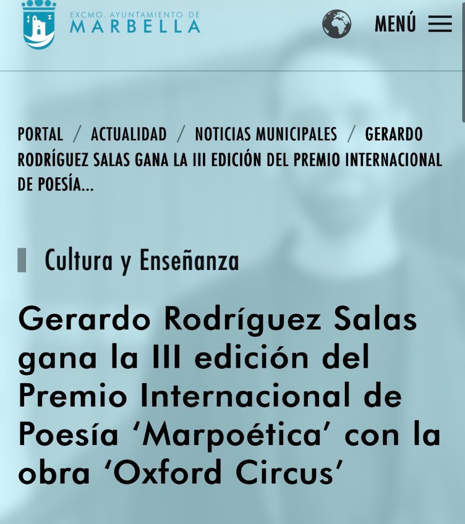 El miércoles 3 de diciembre de 2025 recogí en Marbella el III Premio Internacional de Poesía Marpoética con la publicación de mi poemario ‘Oxford Circus’ (Visor). La TV de Marbella se hizo eco de todo el evento.