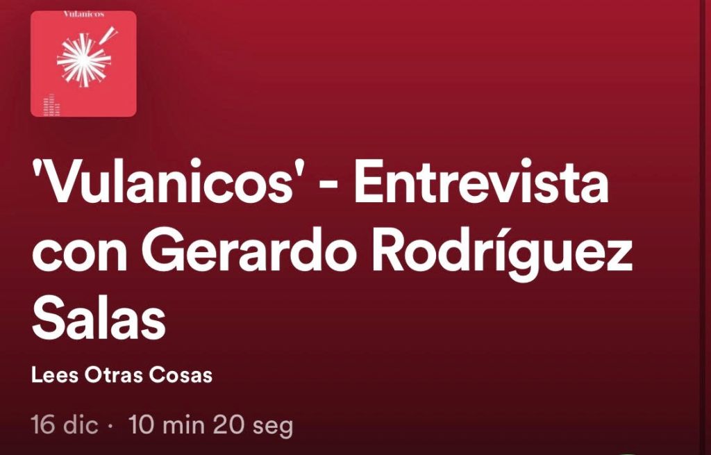 Entrevista a Gerardo Rodríguez Salas para el podcast del Club de lectura feminista y LGTBI+ de Granada ‘Lees otras cosas’. Nos habla de su debut como dramaturgo, Vulanicos (prólogo de Alberto Conejero) con el que inaugura la colección ‘Teatro bajo la arena’ del Patronato Cultural Federico García Lorca de la Diputación de Granada.