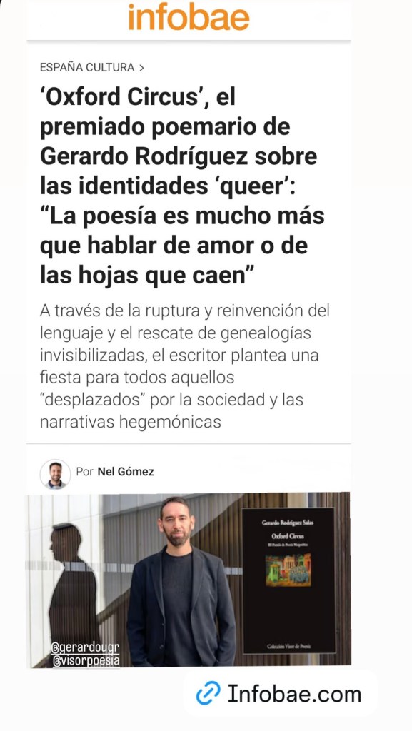‘Oxford Circus de Gerardo Rodríguez Salas (Visor) encontramos una estación de metro convertida en metáfora existencial. Los andenes son limbos donde aguardan los desplazados del siglo XXI, y cada tren que pasa arrastra consigo fragmentos de identidades rotas. El poeta actúa como un cartógrafo urbano que mapea no calles sino soledades, trazando las coordenadas exactas del desconcierto contemporáneo en una ciudad que promete todo y no ofrece nada.’