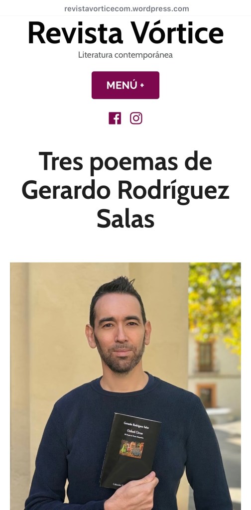 La revista Vórtice publicó tres poemas de mis tres libros de poemas publicados hasta la fecha: Anacronía, Los hilos de la infamia y Oxford Circus.