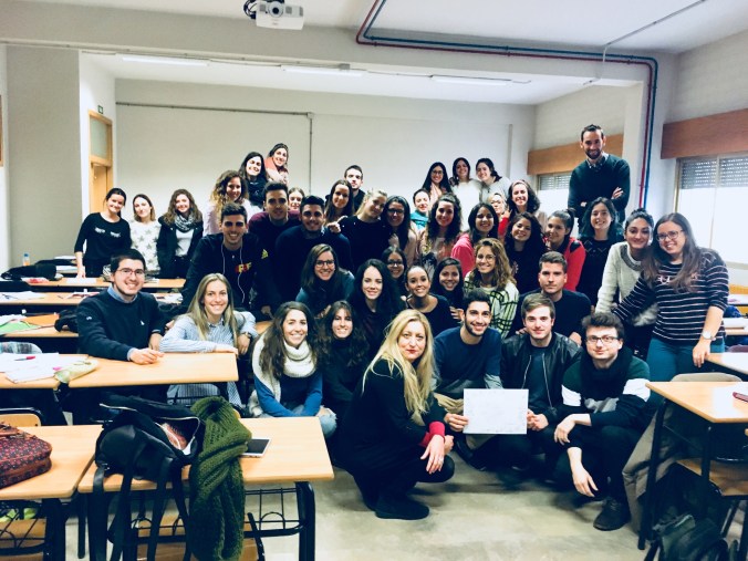 Alumnado de la clase de ‘Ficcionalidad’ junto a la Profesora Cristina Pérez Valverde (en el centro) y yo a la derecha
